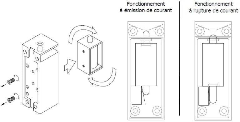 Le verrou est livré prêt à l’emploi en mode émission de courant. Si nécessaire, vous pouvez facilement passer en mode rupture de courant grâce à un mécanisme ingénieux :